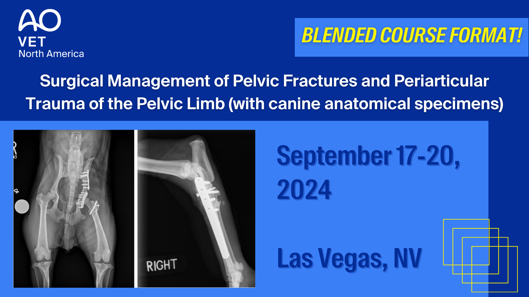Are you ready to elevate your veterinary surgical skills and provide better care for your patients? Join us for the AO VET NA Blended Course—Surgical Management of Pelvic Fractures and Periarticular Trauma of the Pelvic Limb (with canine anatomical specimens) from September 17-20, 2024, in vibrant Las Vegas, Nevada.