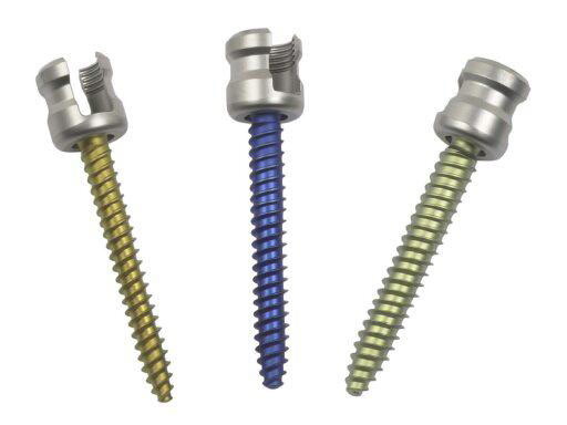 The self-tapping screw features dual core design, double lead thread, and rounded tip. The rotatable head is pre-assembled. The screw head can freely rotate around the screw axis, allowing alignment with the rod without adjusting the screw insertion depth. Compared to the Clickx Polyaxial, the profile has been reduced by 2 mm.