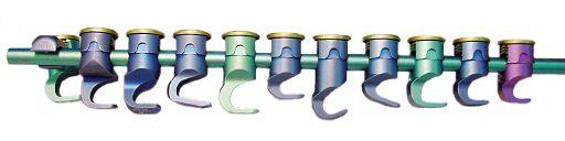 The ClickX Hooks offering includes pedicle, transverse process, and lamina hooks. The ClickX Lamina Hooks are available in a variety of sizes and angulations including up- and down-angled, tall-body, offset, and thoracic lamina hook geometries.
