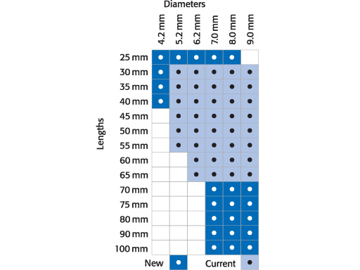 Additional diameters and lengths for the ClickX, dual core, standard or preassembled enlarge the surgeons options.