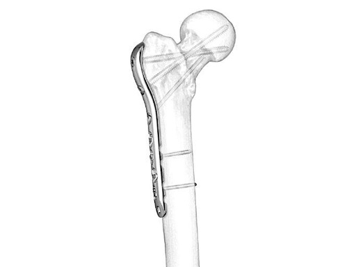 78-year-old osteoporotic female with a left subtrochanteric femur fracture. The proximal femur has a frontal plane fracture in it. Advantages include excellent purchase of the osteoporotic proximal segement, avoidance of abductor devitaliation, and reestablishment of the normal neck-shaft angle.