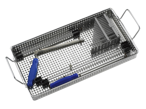 The set also contains a Cleaning Brush for the K-Wire hole, a Sterilizing Tray, an Insert for Screws and a Lid to enable proper storage of the instruments.