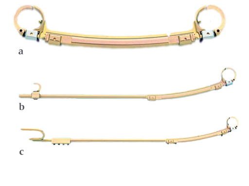 The ends of the inferior and superior cradles mate with the ribs. They are available as neutral, angled right, and angled left to best fit rib cradles is T-shaped for enhanced strength. The rib sleeve is the central section of the construct. This acts as a track for the cradles. The distraction locks are inserted into holes at both ends of the construct to attach the superior cradle and either the inferior cradle or the lumbar extension. The position of inferior cradle assembly along the rib sleeve depends on the desired length of the overall rib prosthesis construct. All of these configurations are required to accommodate extensive differences in anatomy that exist in these patients. Associated manual instrumentation is available for distraction, insertion, expansion, and removal of the VEPTR.