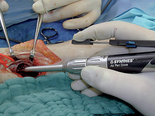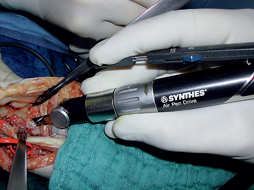 The Air Pen Drive (APD) is a pen-shaped high speed, air-driven surgical power tool for small and micro bone surgery. The set contains a machine washable hand piece, an air hose, 27 attachments (similar to those of the Electric Pen Drive (EPD), already available), as well as similar accessories, such as cutting tools, irrigation nozzles, irrigation tubing etc. The range of application covers trauma (hand, foot, and shoulder), spine, neuro-, as well as craniomaxillofacial surgery.
