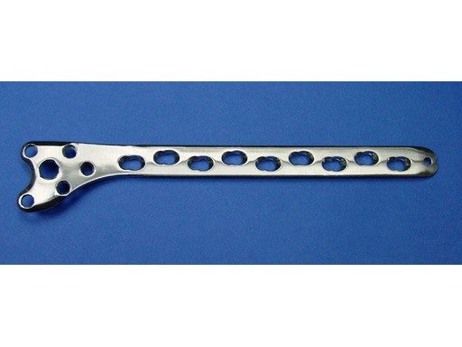 The implant is anatomically pre-shaped and has Locking Compression Holes in the shaft, a limited contact profile and locking screws in the head. The primary feature of the system is its ability to use either locking or compression screws. Locking screws in the head of the plate form an angular stable screw-plate construct.