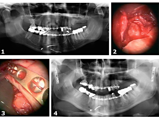 Panoramic radiograph postoperatively after endoscopic assisted reduction and fixation of both condylar fractures.