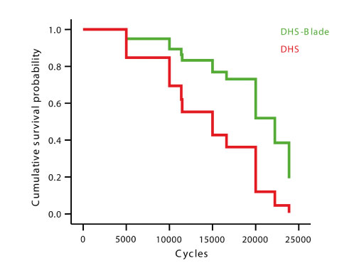 With the applied loading regime a total of 100% cut-outs occurred in the DHS group compared to 50% in the DHS blade group. The survival probability in terms of cut-out resistance was significantly higher for the DHS blade (Fig 2) (P=.023).