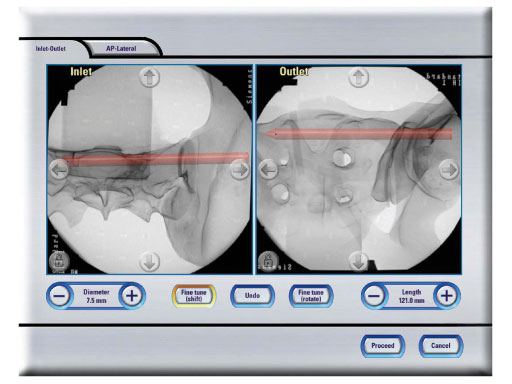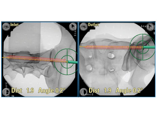 The Posterior Pelvic Ring Fixation Module guides surgeons through the complex anatomy of the pelvis during a screw fixation of the posterior pelvic ring. An easy-to-use interface enables intuitive planning and insertion of sacroilliac screws, based on multiple intraoperatively obtained C-arm images. The display simultaneously shows the surgical instruments in all relevant views (inlet, outlet, AP and lateral), and the surgeon is safely guided to the desired target position. This virtual fluoroscopy also substantially reduces radiation time, and is particularly useful for C-type fractures, according to the Mller AO Classification.
