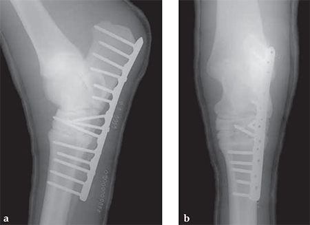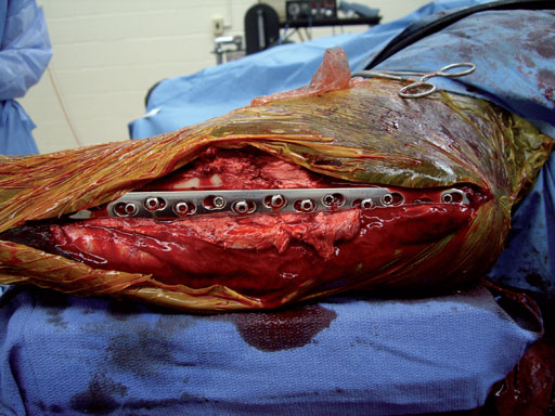 The broad LCP 5.5 is indicated for treatment of fractures and joint arthrodeses in large animals, such as equine and bovine patients. The plates have a width of 17.5 mm and a thickness of 6 mm and are specifically designed to accommodate the extreme weight of adult large animals and enable immediate weight bearing postoperatively.