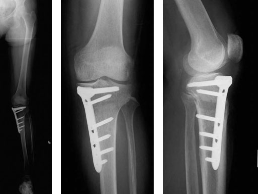 This new plate was developed taking into consideration the requests of knee surgeons in Japan. Based on CT scans of the typical Japanese patient (60-year-old female weighing less than 60 kg), the plate widths at head and shaft, plate radius, and the radii surround were reduced. This improved anatomical fit for the typical small stature patient will decrease pain due to minimizing the risk of complications with wound closure or irritation of soft tissue and skin. High-tibia osteotomy (TomoFix HTO) small stature is indicated for all open-wedge osteotomies on tibiae in small patients with less than 65 kg without postoperative restriction. Otherwise, the small stature version has the same indications as the standard plate TomoFix HTO.