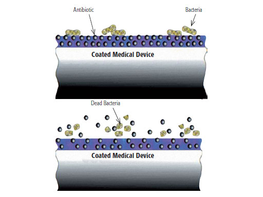 An antibiotic coating on an implant may prevent the bacteria from colonizing on the implants surface. In addition a coating with high local antimicrobial concentrations could protect the site of injury and avoid side effects resulting from long term high dose systemic antibiotic therapy.