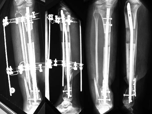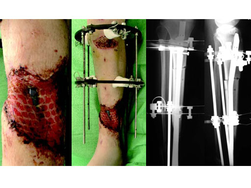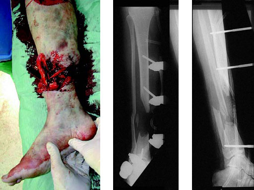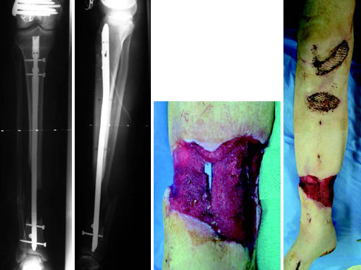 Despite improvements in the prophylactic and the therapeutic measures, soft-tissue damage and consecutive infection remain the major dilemma in the healing process of long bone fractures. Osteomyelitis is a consequence of local contamination by germs combined with a local and/or systemic immunodeficiency. Additionally, blood supply in the traumatized bone is disturbed which means systemic applied antibiotics do not reach the fractured region. In consequence, the further course may lead to severe disability including soft-tissue and/or segmental bone defects, impairment of joint motion, or even amputation. Once osteomyelitis has occurred, removal of the implant and aggressive debridement of the infected bone as well as soft tissue, combined with heavy local and systemic antibiotic therapy often represent the only option of treatment.