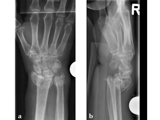 A 74-year-old woman sustained an intraarticular distal forearm fracture of the radius and ulna after falling on her outstretched hand.