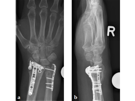 Fig 4ab X-rays 3 days postoperatively: removable splint, early motion with physiotherapy.