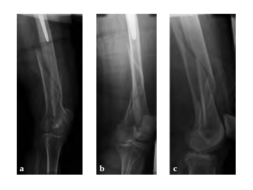 Periprosthetic fractures are increasing because of the aging of the population, more active old people, the development of endoprosthetics and an increase in the number of patients with long-standing implants. The incidence has been reported to be 1.5% for primary procedures and 4% for revisions [1]. Because of the prosthesis stem (or a nail) in the intramedullary canal it is not possible to insert screws bicortically as it would be needed. These fractures are mainly treated with cable systems and monocortical screws with the disadvantage of high invasiveness and the possibility of cutting into osteoporotic bone.