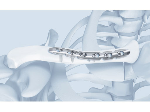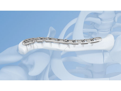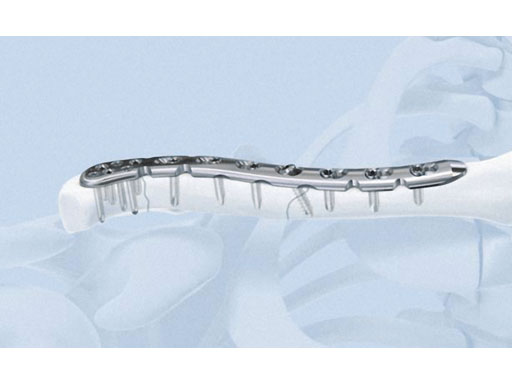 The existing 3.5 mm LCP superior anterior clavicle was designed to fit on the superior end laterally and twist midshaft to fit anteriorly on the medial aspect. The new 3.5 mm LCP superior clavicle plate design has removed the twist in the plate. A lateral bow was put in the plate to enhance plate fit. The flat superior design allows more flexibility in placement. A K-wire hole was added to the distal end of the plate as a plate holder. Notches in the plate facilitate easier contouring that may be required in some cases. Diverging and cross-hatching screw pattern in the lateral end increase fixation strength.