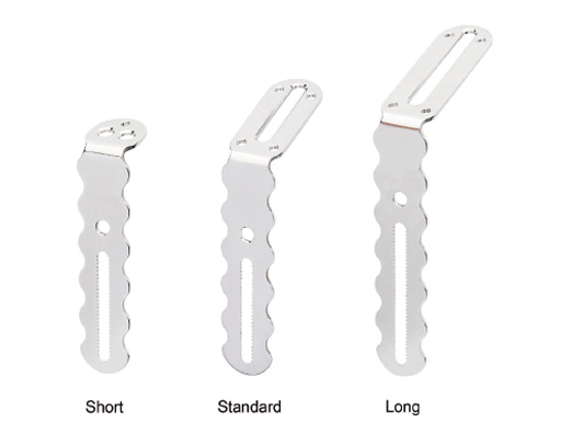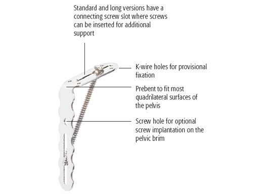 The new 3.5 mm quadrilateral surface plates are intended for use in acetabular fracture patterns amenable to an anterior surgical approach, which have an important component of quadrilateral surface comminution. They are typically used in conjunction with pelvic reconstruction plates. There are three plate sizes (short, standard, and long) available which are made of 316L stainless steel and are part of the 3.5 mm low-profile pelvic system. The standard and long plate versions have a connecting screw slot where triangulated buttress screws can be inserted for additional support (Fig 1). These interconnecting screws should be 2 mm longer than the actual length measured to ensure that the screw engages the serrated teeth of the plate at the quadrilateral surface. All plates are prebent to fit most quadrilateral surface anatomy, but minor contouring may still be necessary. Reconstruction plates are often placed on the pelvic brim or the endopelvic surface over the 3.5 mm quadrilateral surface plates to aid final plate fit and provide additional buttress function (Fig 2, Fig 3).
