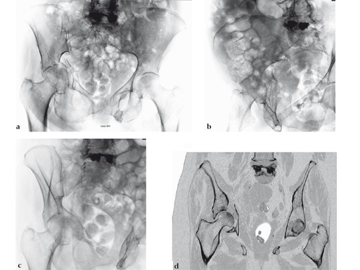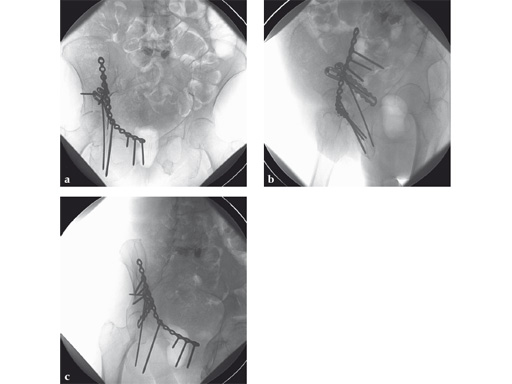 Fig 4ac AP pelvis and Judet oblique x-rays 9 months postoperatively. The patient started full weight bearing at approximately 10 weeks postoperatively. The fractures healed without secondary displacement. The patient returned to preinjury (relatively limited) activity level with no significant residual pain complaints.