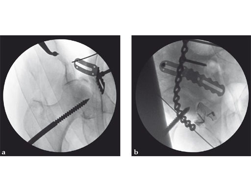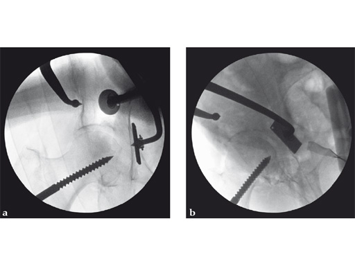 Fig 2ab Intraoperative AP hip and iliac oblique image intensifier images of a portion of the reduction sequence utilizing distal/lateral traction through a Schanz screw, ball spike (picador) with disc and asymmetrical reduction clamp with disc. The remaining area of incompletely reduced articular surface was a free, thin osteochondral fragment retrieved through the anterior column fracture. It was reoriented and trapped between the lateral articular surface, displaced anterior column, and femoral head. Despite multiple attempts this position could not be further improved. Cancellous autologous bone graft was used to buttress this area through a small internal iliac fossa cortical window.