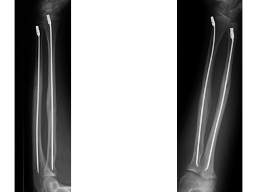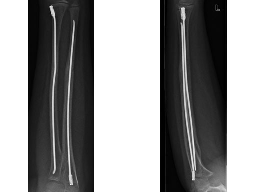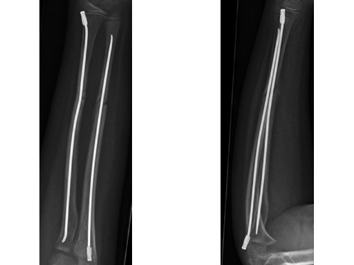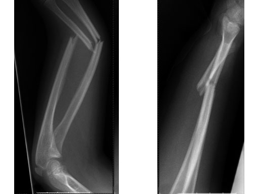 Case 2: Oblique forearm, shaft fracture (22D/5.1) with end caps, 11-year-old boy.