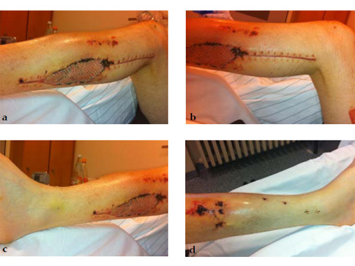 Case 1: A 33-year-old man with a third degree open fracture of his left tibia was initially treated with an external fixator and unilateral compartment release. He had undergone ACL reconstruction in the past.