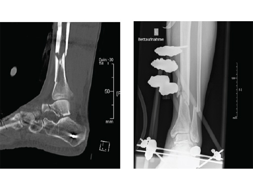 Case 2: Grade II open distal tibial fracture in a polytraumatized 52-year-old man.