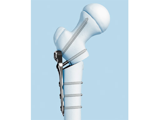 The plate is available in 3.5 mm (19 mm wide and 70 mm long) and in 5.0 mm (23 mm wide and 90 mm long). Both plates have two neck screws and one calcar screw proximally as well as combination holes for locking or cortex screws distally. All plates are available in sterile and non-sterile and have a universal design for left and right proximal femurs.