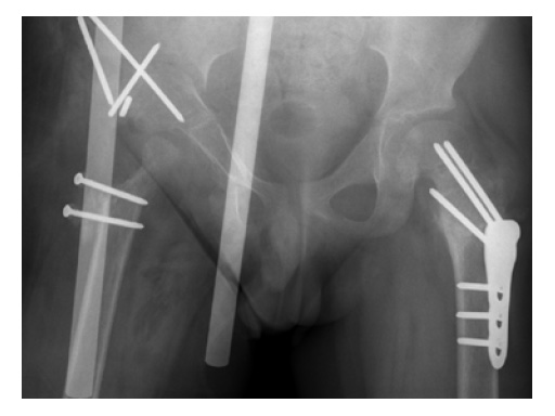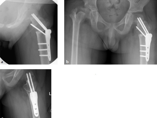 Case 2: LCP PHP 140. A 9-year-old boy, weighing 30 kg, had postinfectious pseudarthrosis of the femoral neck and varus deformity. His preoperative CC D angle was 80.