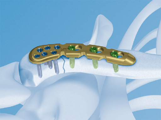 Synthes offers a variety of anatomical precontoured plates: the superior, anterosuperior, and anterior clavicle plates. The anterosuperior clavicle plates are also offered with a so-called lateral extension accepting insertion of six 2.7 mm-head locking screws. This also helps to extend the range of indications for even lateral comminuted clavicle fractures. Open reduction and plate fixation can be classically performed via a sabre-cut incision. Alternatively a minimally invasive approach can be used very nicely and is recommended by the authors. The 3.5 mm clavicle hook LCP and the titanium elastic nail complete the repertoire. It is therefore possible to address every midshaft clavicle fracture individually.