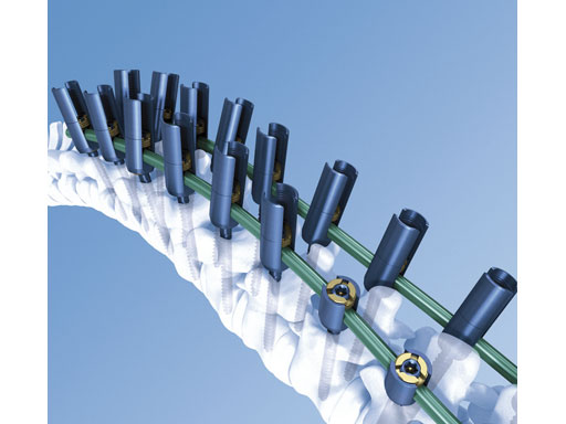 Rod reduction and curve correction will be performed by reducing the locking cap within the extended tabs. As soon as the rod is fully reduced by the locking cap, the rod can be derotated to correct the deformity according to the Cotrel-Dubousset technique [4, 5]. To fine-tune the deformity reduction and to reduce the prominence of the rib hump, individual vertebral bodies can be segmentally rotated with the help of derotation tubes. After final tightening of the screws, the extended tabs are broken off the screw at their indented break-off line.