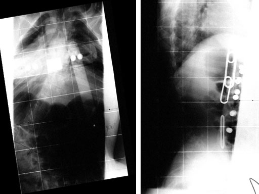 A 23-year-old man with neurogenic kyphoscoliosis, Cobb angle: 120. Fusion of T7S1 with universal reduction screws. Duration of surgery: 4.5 hours.