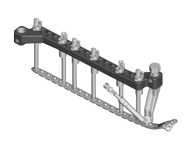 An aiming arm is available for minimally-invasive screw insertion, and is suitable for all plate types (right, left, small bend, large bend).