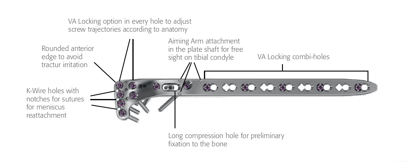 Suture-holes in the plate head facilitate meniscus reattachment, and the aiming arm makes a minimally-invasive percutaneous screw insertion possible.