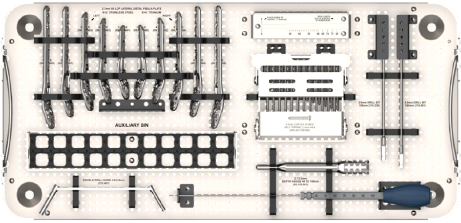 An essential benefit of the plating system is the option to have a fully self-contained system with a full complement of plates, screw types, and instrumentation; there is almost no need for supplemental hardware sets to be opened. The sets of the Variable Angle LCP Ankle Trauma system are modular to allow customized selection of implants, which also reduces inventory and overall costs by eliminating seldom-used implants.