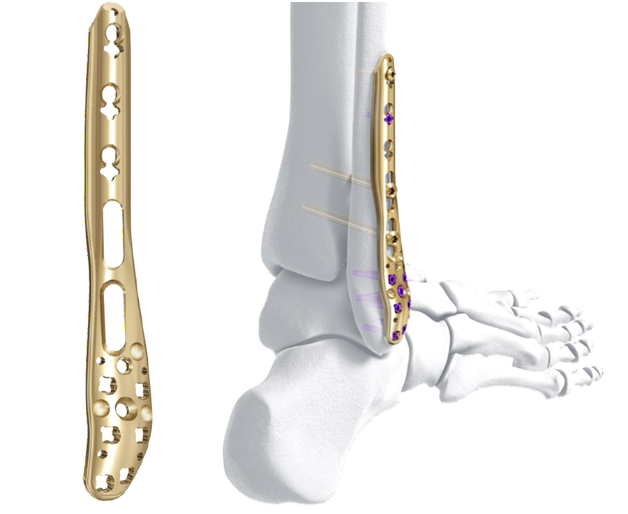 The design rationale for the Variable Angle LCP Ankle Trauma 2.7/3.5 system has paralleled the evolution of approaches to periarticular fracture care. With improved appreciation of the benefits of fracture configuration- guided surgical exposures, a greater variation of plating surfaces are now utilized. New plate contours are essential to optimize buttressing function and distal screw positions. The new complement of ankle plates provides ideally contoured plates for all common plate positions around the tibia and fibula. The new plate shape design has improved the distal fit of all of the plates, and minimal contour is necessary to obtain full surface plate bone apposition. The posterior tibial plate options provide excellent posterior buttress for posterior partial articular fragments, even via the posterolateral insertion portal.