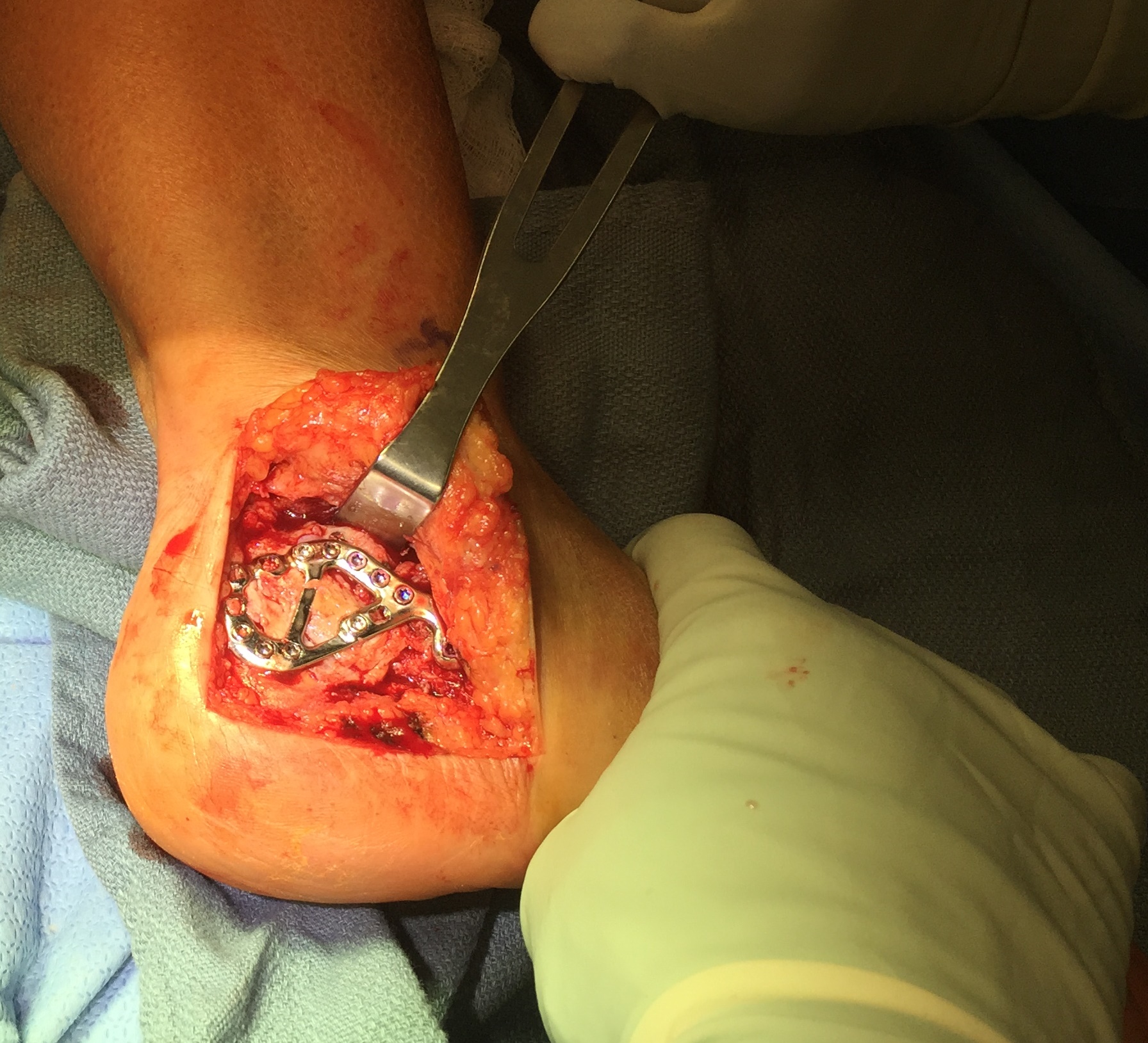 An extended triple arthrodesis was performed. Medially, the new Medial Column Plate was used, securing the talonavicular, naviculocuneiform, and tarsometatarsal joints (Fig 2). The X-plate is lateral and secured the calcaneo-cuboid joint. Two 7.3 mm screws were used to secure the subtalar joint.