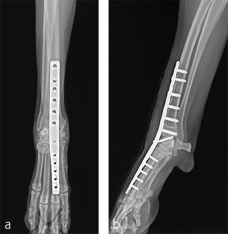 Immediate postoperative images confirmed anatomic alignment and adequate carpal extension (Fig 10). At the 11-week postoperative follow-up examination, functional recovery was very good with images revealing stable implants and healing of the arthrodesis (Fig 11). The dog was then allowed to return to normal activity.