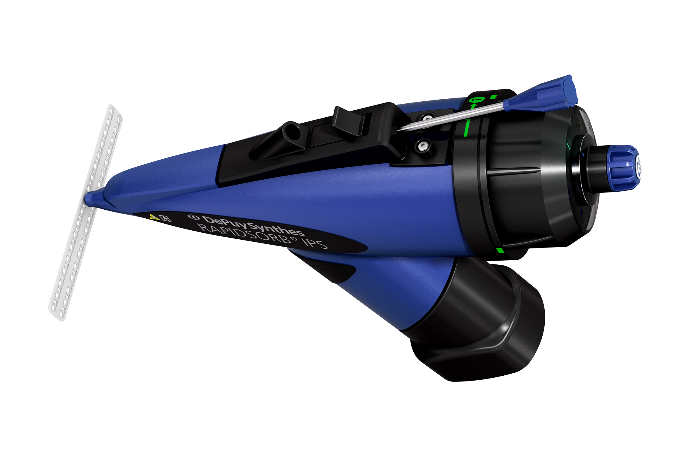 The fastener cartridge allows seamless delivery of polymer into multiple holes. The risk of screw insertion failure through stripping or breaking is eliminated. Since fixation occurs through the delivery of the polymer in a semi-solid state, the need for multiple screw sizes is also eliminated. The starter kit includes the Rapidsorb IPS shell, the cap, and a fastener cartridge that produces approximately 15 fasteners. The material provided in the fastener cartridge is the familiar Rapidsorb 85:15 poly (L-lactideco-glycolide).