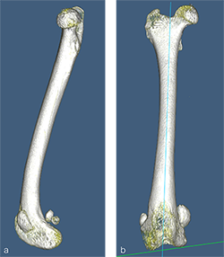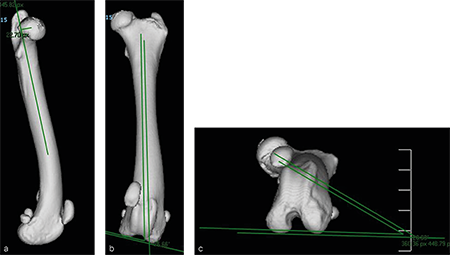 A 4-year- and 6-month-old spayed female mixed breed dog weighing 25.1 kg presented for chronic progressive left pelvic limb lameness. Orthopedic examination and preoperative x-rays revealed a grade 3/4 medial patellar luxation without concurrent cranial cruciate ligament rupture. A preoperative computed tomography (CT) was performed to screen for femoral varus and/or femoral torsion. Femoral varus was documented (anatomical Lateral Distal Femoral Angle [aLDFA] 104, normal 92-96). The femoral torsion angle was 26 and was like the unaffected contralateral limb and within the normal range. The planned correction was a 12 lateral closing wedge ostectomy, with concurrent sulcoplasty and tibial tuberosity transposition. The mediolateral view of the preoperative CT 3D reconstruction of the left femur (Fig 5a) illustrates anatomical anteversion of the femoral head and neck and procurvatum of the femur, and the craniocaudal view (Fig 5b) confirms distal femoral varus (anatomical Lateral Distal Femoral Angle, 104).