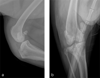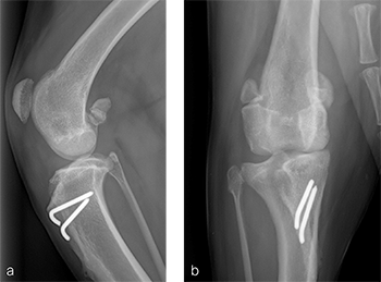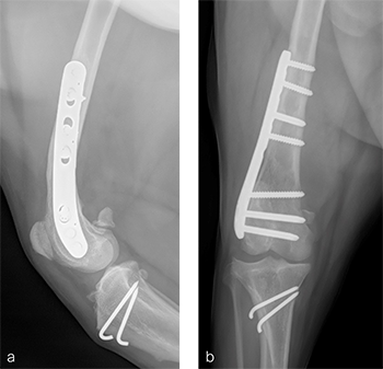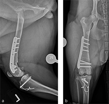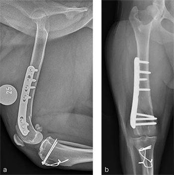 A routine lateral approach to the distal femur and stifle joint was performed. Results of the cruciate ligaments examination were normal. The lateral joint capsule was dissected to expose the distal femoral condyle. An alignment jig was placed in a craniocaudal direction to ensure that deformity correction was limited to the frontal plane. A 12 lateral closing wedge ostectomy was performed and the femoral condyle was reduced and temporarily stabilized with divergent K-wires. A 7-hole left 3.5 LCP DFO plate was placed on the lateral femur and secured with a combination of 3.5 mm cortex and locking screws. The compression function of the plate was used to compress the ends of the two bone segments. Temporary K-wires were removed and a wedge sulcoplasty was performed to deepen the trochlear groove for improved patella articulation. A tibial tuberosity transposition was performed and stabilized with two pins and tension band wire. Routine closure was performed. Total surgical time was 1 hour and 45 minutes. Postoperative x-rays demonstrate the position of a left, 7-hole, 3.5 LCP DFO plate and associated tibial tuberosity transposition. In the medioateral view it can be appreciated that plate contour matches the normal distal femoral procurvatum and screws are positioned caudally away from the trochlea (Fig 6a). This allows for an unimpeded sulcoplasty while maximizing screw purchase caudally. The compression applied with the plate has resulted in excellent apposition. The patella is visible within the trochlear groove. In the craniocaudal view the plate contour matches the anatomical contour of the distal femoral condyle (Fig 6b). The anatomical Lateral Distal Femoral Angle is reduced to 92. During the follow up after 8 weeks, clinical signs have resolved, limb use is excellent, and stifle joint range of motion is normal without evidence of pain. In the mediolateral x-ray the osteotomy has healed (Fig 7a). Plate and screw position remain unchanged. The tibial tuberosity transposition is healing, and implants remain unchanged. The patella remains reduced within the trochlear groove. In the craniocaudal view the osteotomy has healed and is no longer visible (Fig 7b). Implants are stable and the patella is tracking normally.