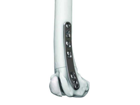 - Precise locking screw trajectories: screw trajectories are designed to avoid intraarticular structures while maximizing transcondylar bone purchase. This feature allows the surgeon to perform a sulcoplasty as needed without screw interference. Screw trajectory also avoids penetration of the intercondylar notch and damage to the cruciate ligaments.