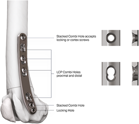- Multiple screw placement options: the plate contains LCP combi holes, stacked combi holes, and allows compression across the osteotomy for primary bone healing.