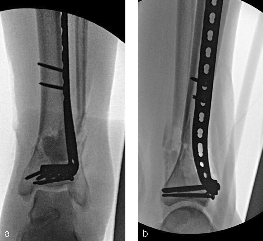 After repeated incision and drainage, 2 days later the fracture was repaired with an anterior lateral tibial plafond plate (Fig 2). Vancomycin and tobramycin impregnated antibiotic beads were placed in the bone defect.