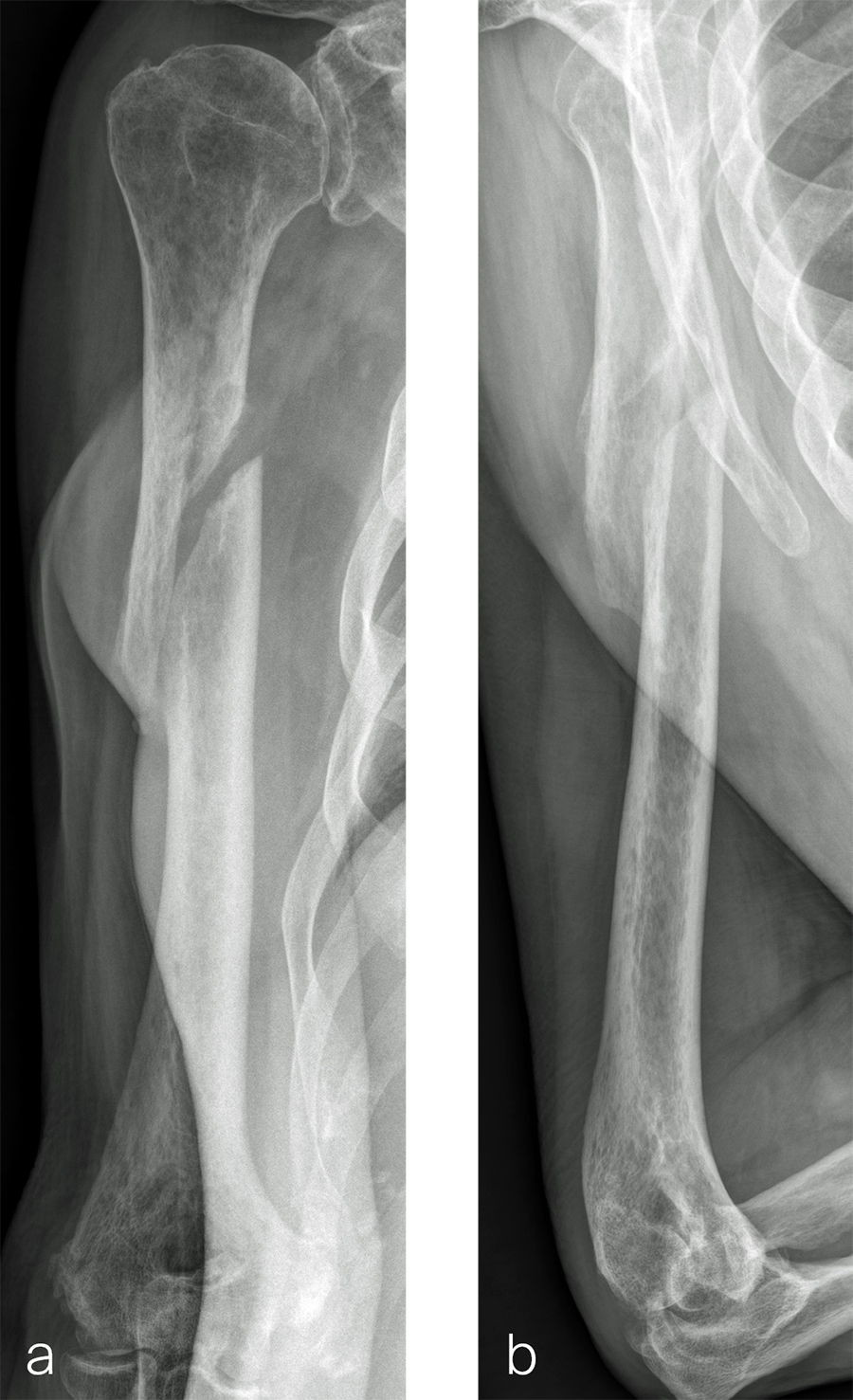 The patient was an 83-year-old right-hand dominant man who sustained a closed right humeral shaft fracture approximately 10 months before presentation. He was not initially offered surgical care and was treated with functional bracing. The patient has moderate pain but mainly complains of instability and lack of strength in his right arm. He was offered surgical nonunion repair with autogenous iliac crest bone grafting but declined iliac crest harvest. X-rays showed oblique nonunion with resorption and confirmed diagnosis of pseudarthrosis (Fig 7).