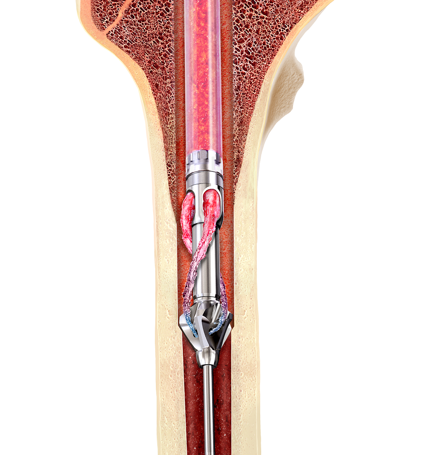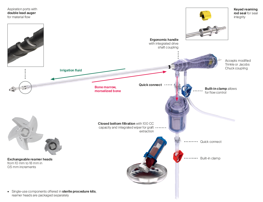 The RIA System (Figs 2, 4 and 5) provides an efficient method for obtaining large volumes of autogenous bone graft. Reaming a medullary canal using the RIA device is clinically proven to have lower complication rates and reduced donor site pain compared to iliac crest bone graft (ICBG).