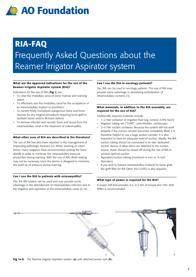 Additionally, the RIA Task Force seeks to educate orthopedic surgeons throughout the world in conjunction with AOTrauma, to facilitate successful use of the new device. The RIATF members have produced educational material (Frequently Asked Questions about the Reamer Irrigator Aspirator system, Fig 7, and Annotated Reamer Irrigator Aspirator Abstracts), which will feature in the curricula of AO Courses on IM nailing, infection, and orthogeriatrics.