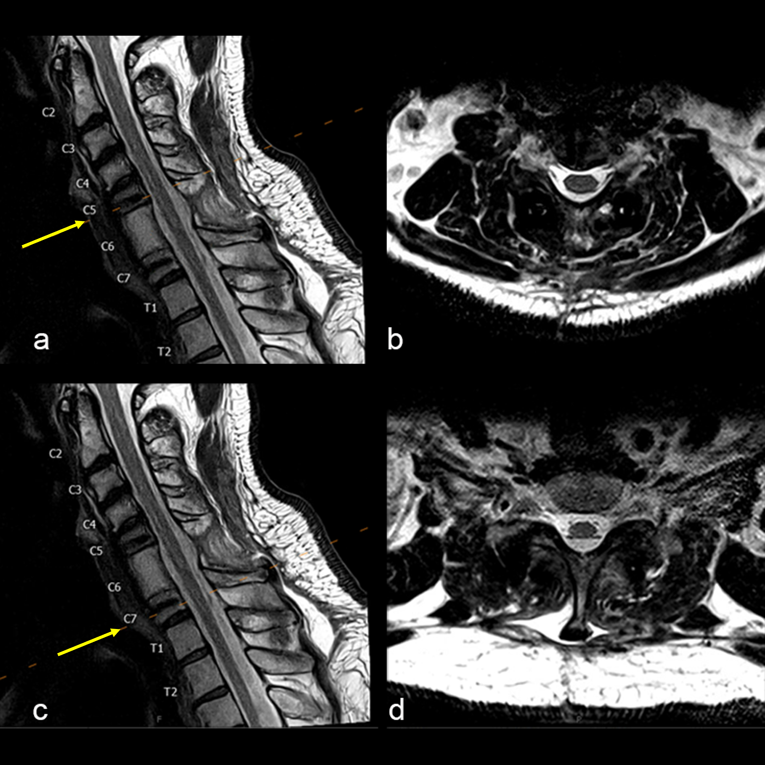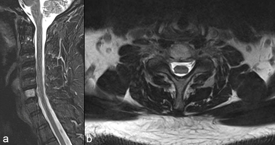A 47-year-old male presented with neck pain. Upon examination, he was neurologically intact. He underwent an MRI of the cervical spine that demonstrated a non-enhancing T1-hypointense and T2-hyperintense lesion (Fig 1).