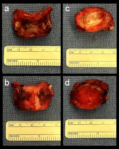 The first stage was a posterior approach with a C3-T3 instrumented fusion using CMORE® Carbon/PEEK lateral mass and pedicle screws (Fig 2) with resection of the posterior elements of C6, mobilization of the C6 and C7 nerve roots and vertebral arteries bilaterally. The second stage was a left sided anterior cervical approach with completion of the C6 spondylectomy and en bloc resection of the C6 lesion. The resected lesion tissue is shown in Fig 3.