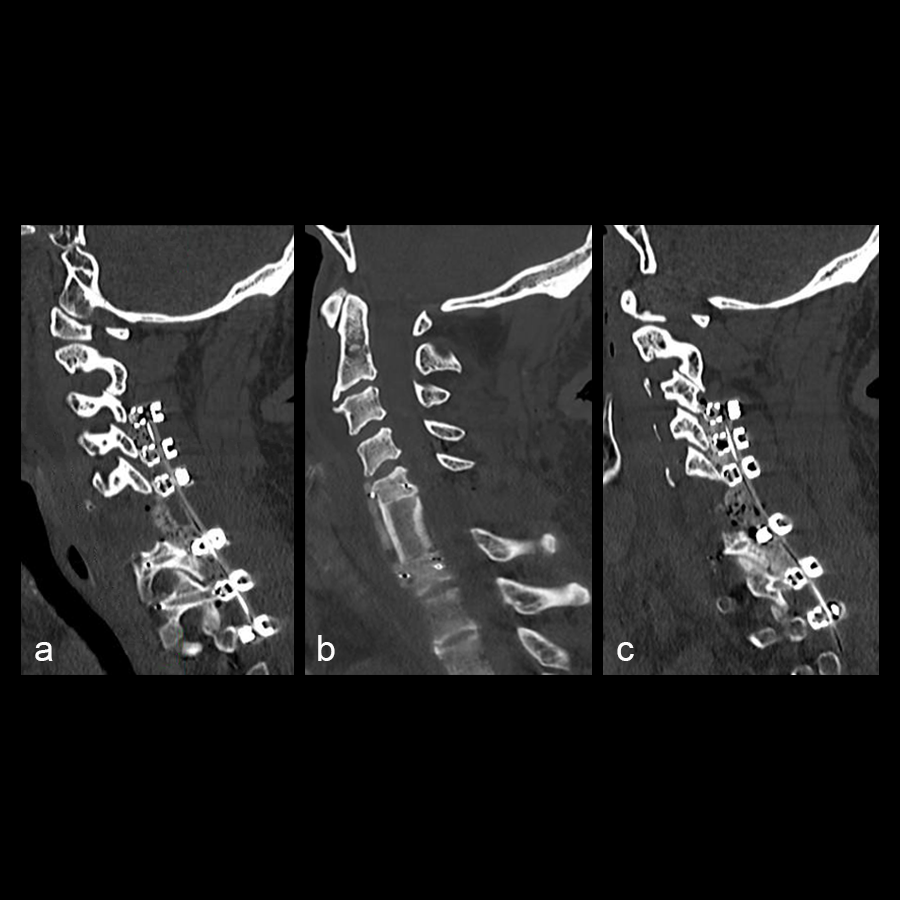 The patient underwent a CT guided biopsy that demonstrated a brachyury positive lesion consistent with a chordoma versus benign notochordal tumor. He underwent a two-stage operation for en bloc resection of the lesion. Cervical spine stabilization was achieved using CMORE® Carbon/PEEK implants. The radiolucent nature of these implants permits artifact-free postoperative imaging and more precise radiation treatment, an important consideration in patients with spinal tumors.