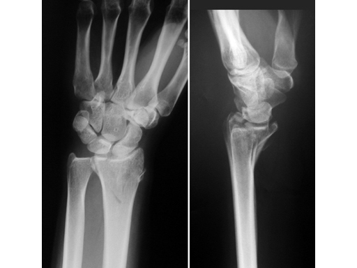 Reversed Barton fracture 23-B3 in a 34-year-old woman after fall on outstretched hand.